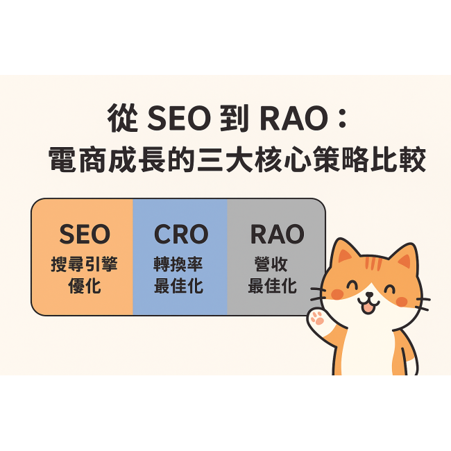 | 項目 | SEO(搜尋引擎優化) | CRO(轉換率最佳化) | RAO(營收最佳化) |